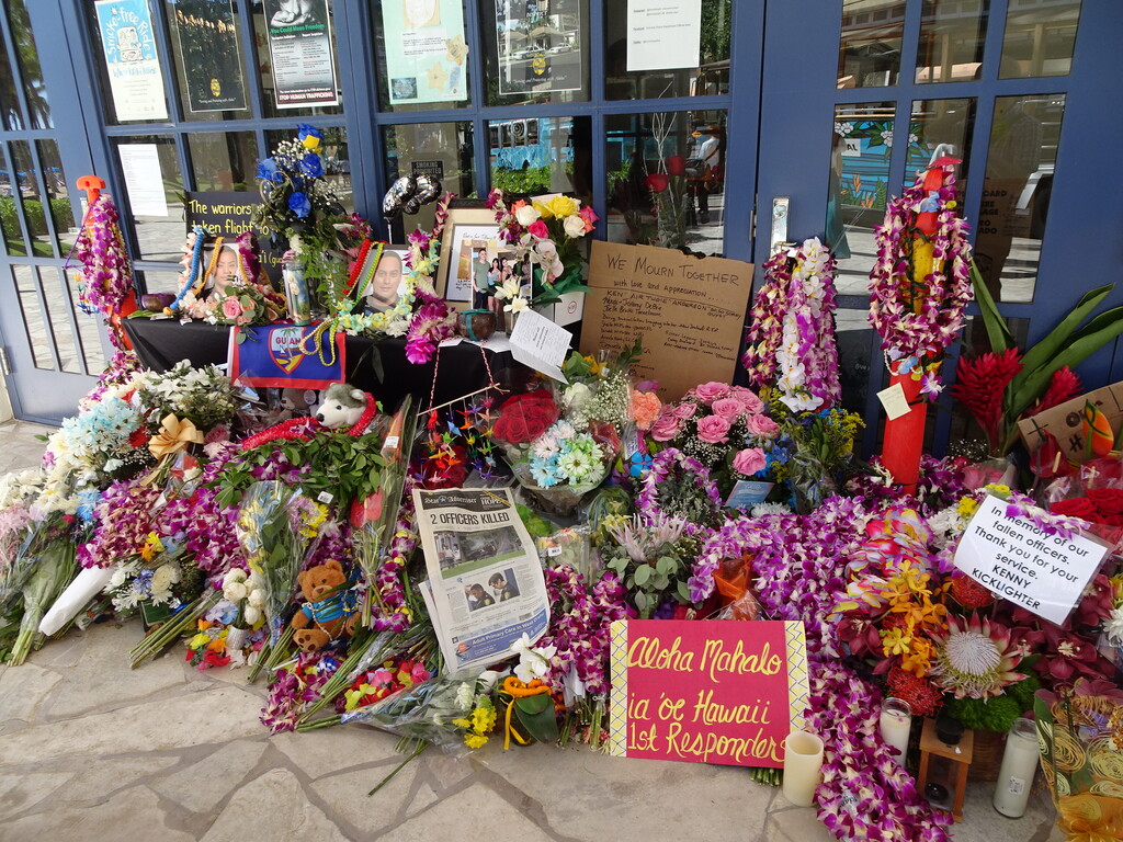 交番の前に供え物が・・・先日ダイヤモンドヘッドの住宅街で殉職した二人の警官