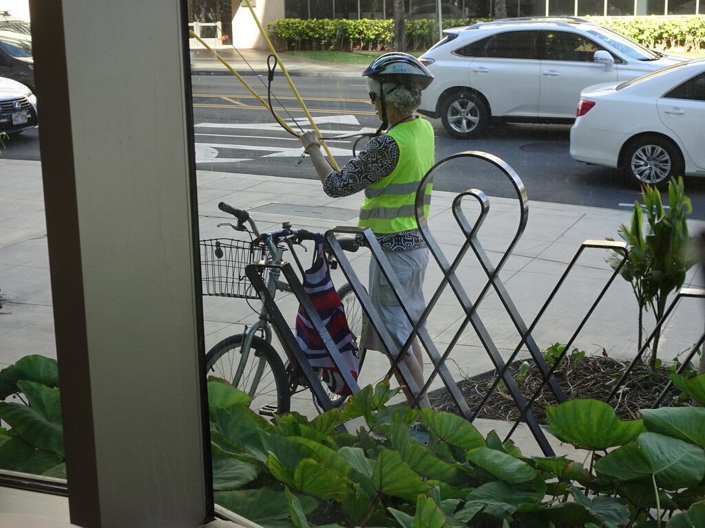 外を眺めてたら おばちゃん前後輪完全ロック 蛍光ベストにメット すごい!