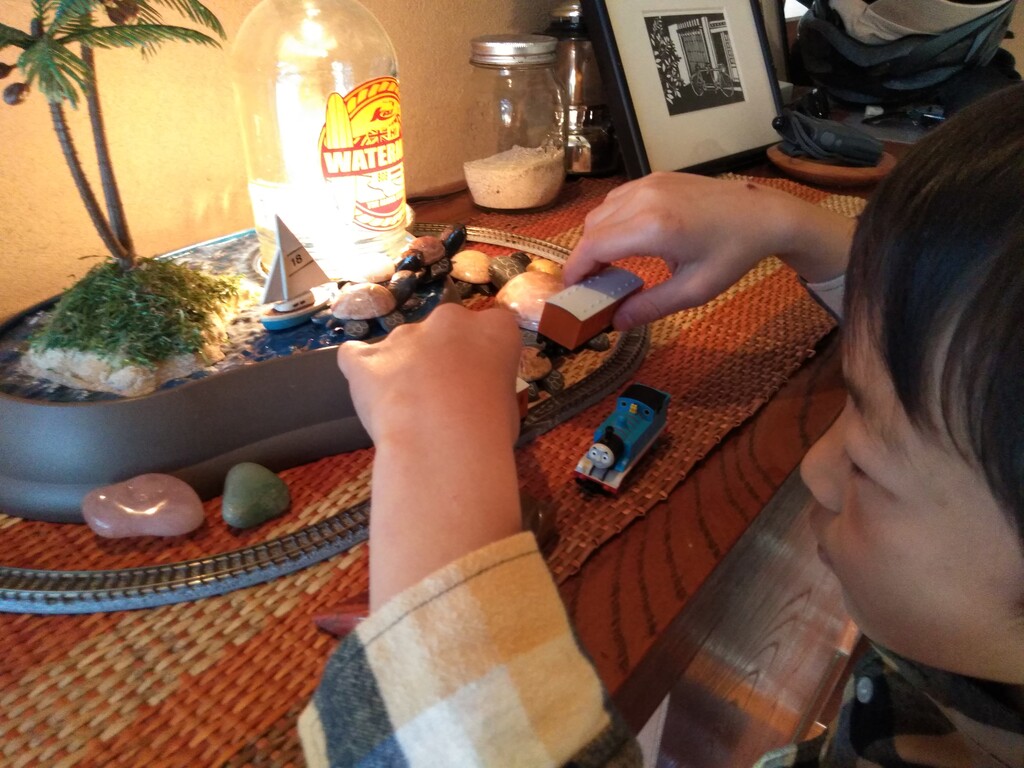 玄関のNゲージをガチャガチャ あー壊さないでよー