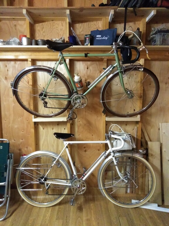 全部吊るすと肉屋みたい 全部床に置いて横に詰めると放置自転車みたい