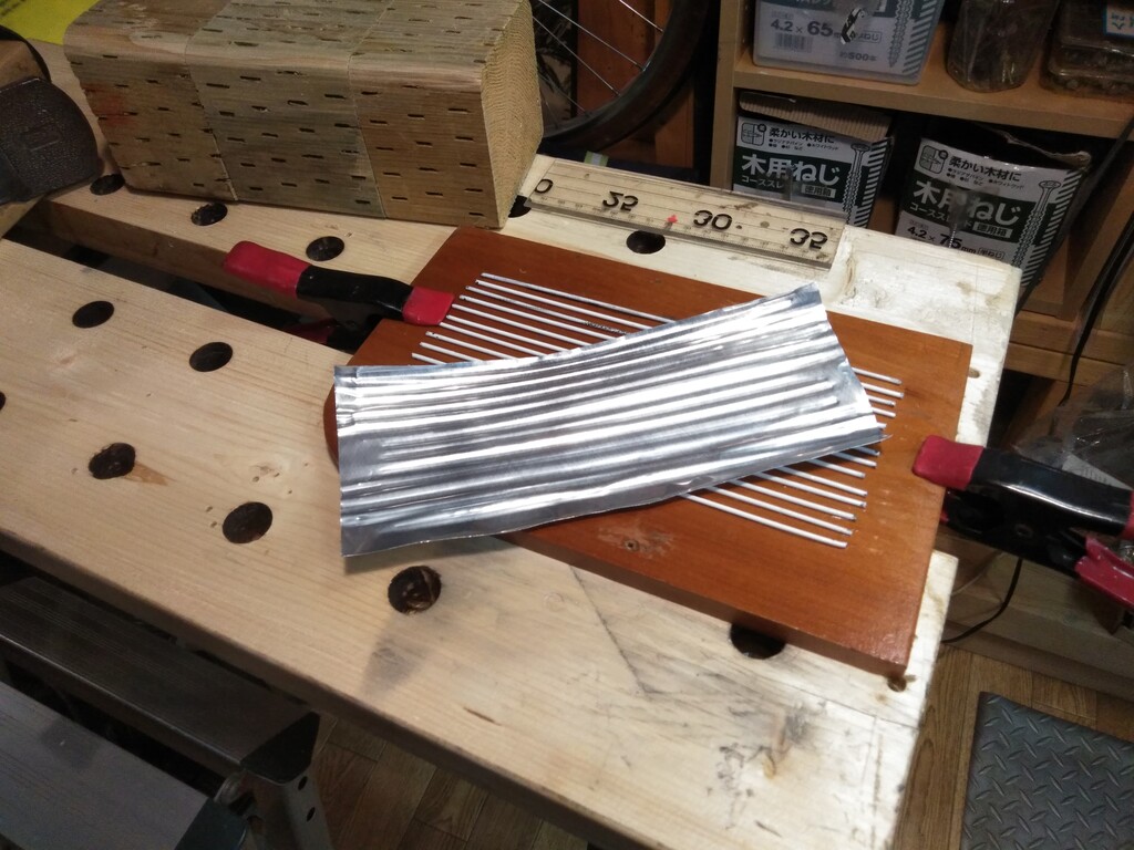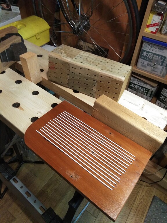 娘が作った本立ての廃材にエポキシ系接着剤を塗って 針金を並べます