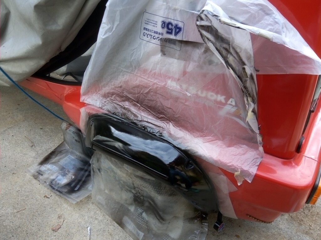 オーバーフェンダーがキズだらけだったのでマスキングして塗り直しました