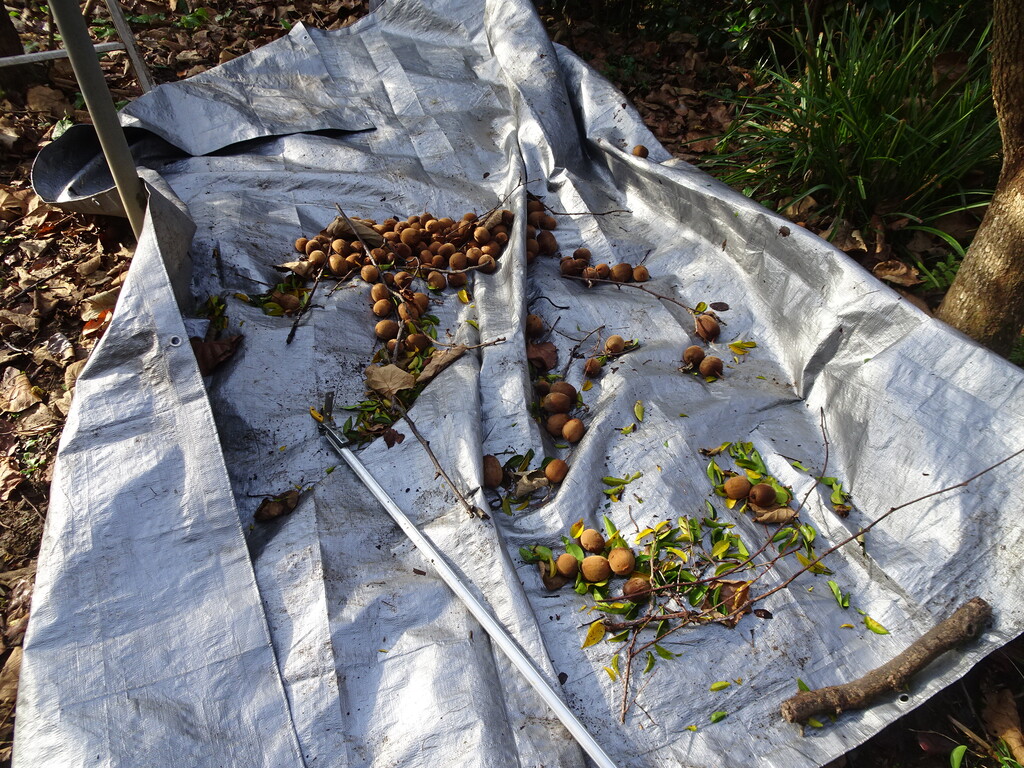 シートを広げておいて 秘密兵器で枝をガサガサ揺らしてキウイを落とします