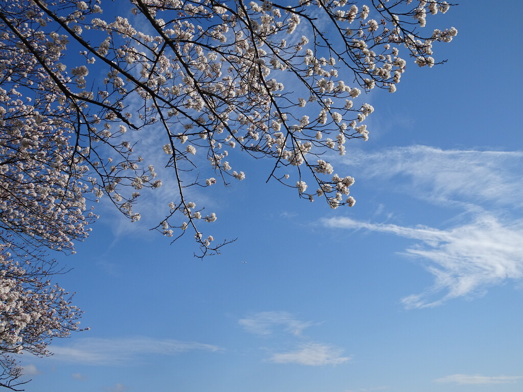 南風が強いので桜の梢に羽田に向かう旅客機がキラリ光りました