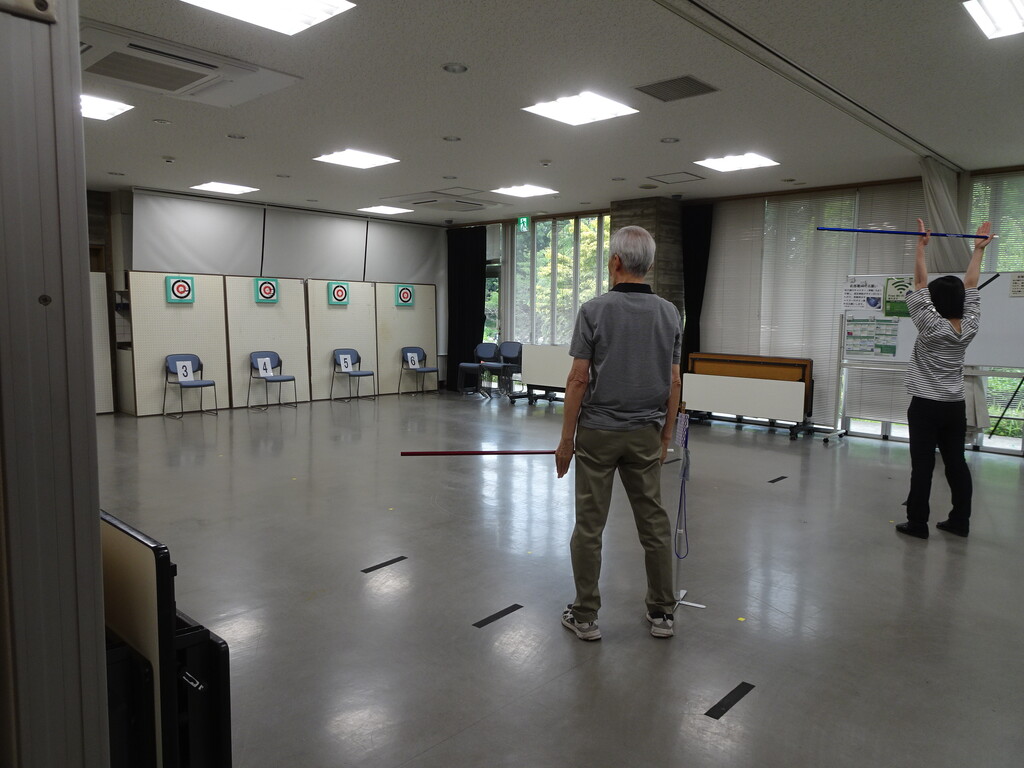 自然資料館でスポーツ吹き矢の練習をしていました