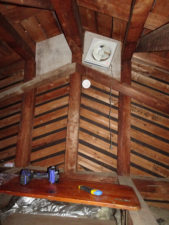 何度も屋根裏と自転車小屋を行ったり来たりして取り付け完了!