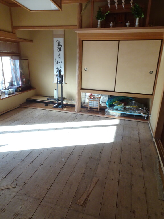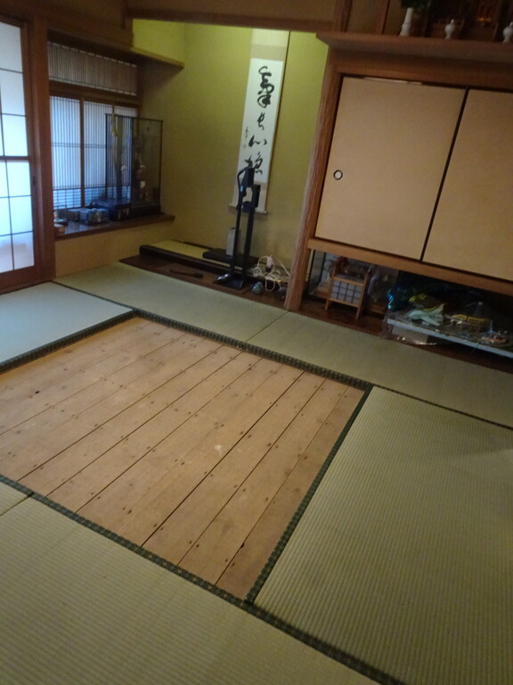 マジックで印を付けて大きい釣り針みたいので畳を引っ掛けて剥がして運び出します
