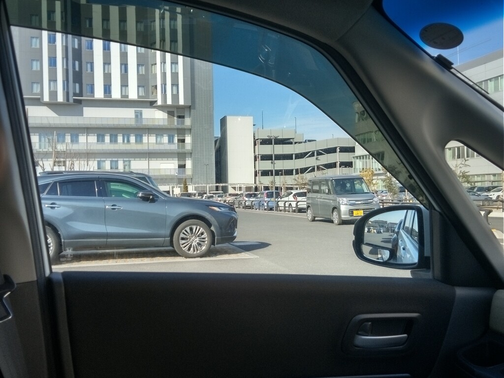 広い駐車場は満車 立体駐車場に入る車が並んでいます