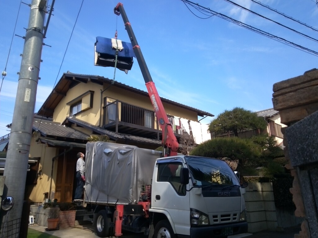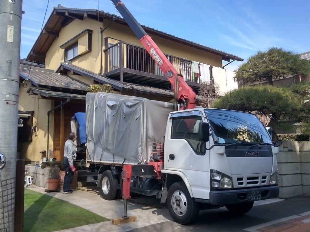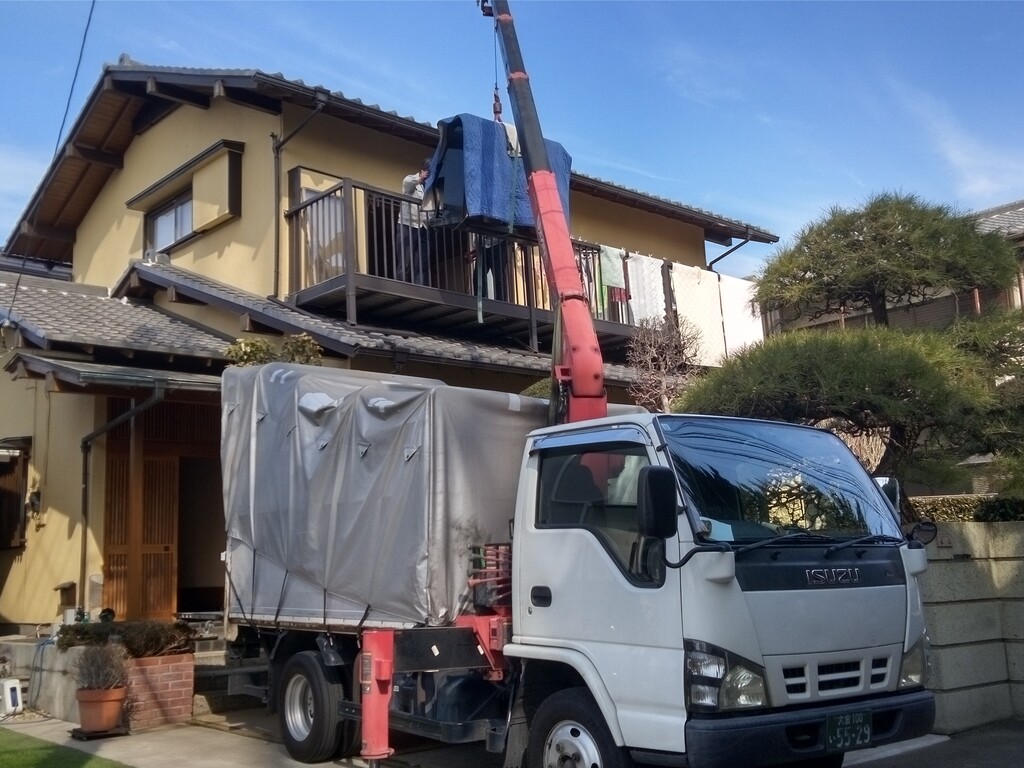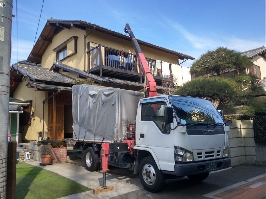 ベランダまで出て来ました ユニックは無線でコントロールしてます