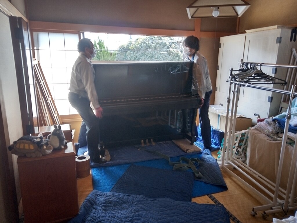 ピアノを立てて廊下を知恵の輪の様に通って和室から外へ出します