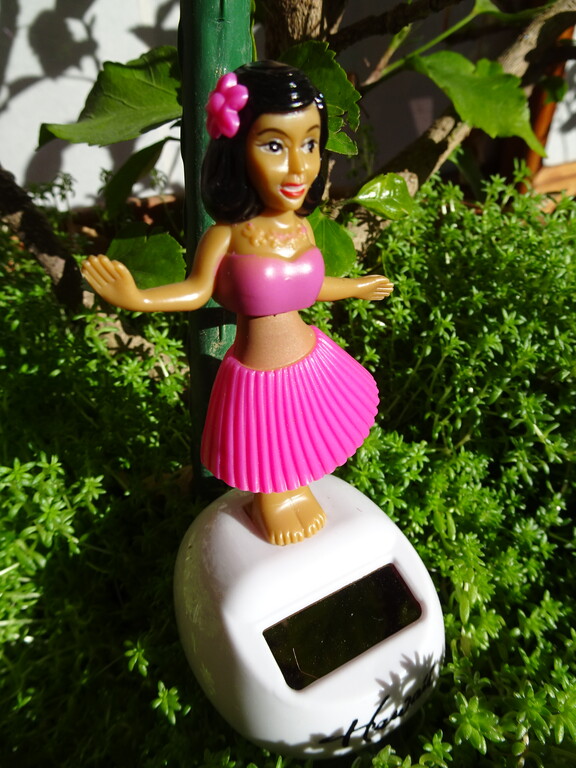 春の日差しを受けて 縁側のソーラーフラ人形が腰を振っています