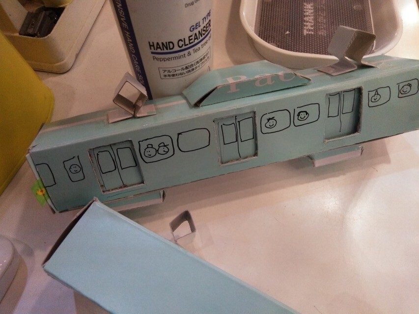 いつも保育園の帰りに寄って遊んで行く子供に即興で靴の箱で電車を作ってあげましたw