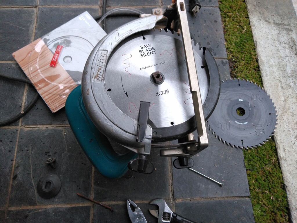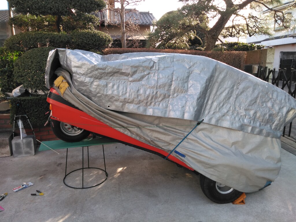 午後には嵐になる予報なので仕事は休みにして シートをタープ風に張って雨の中 大工仕事