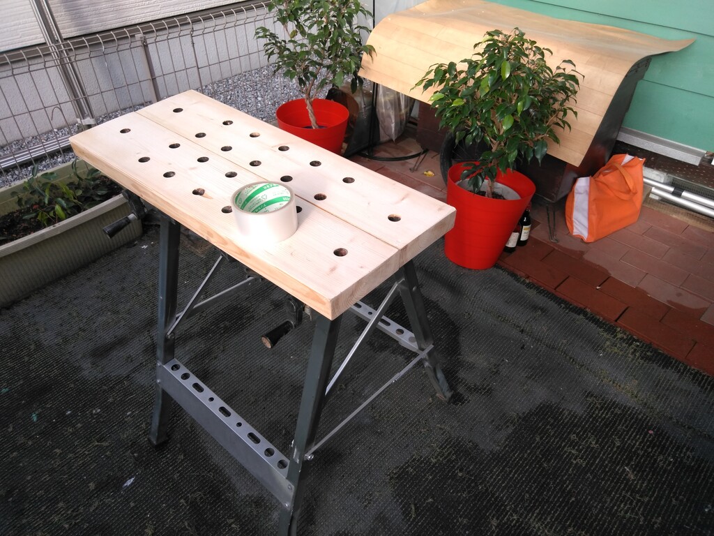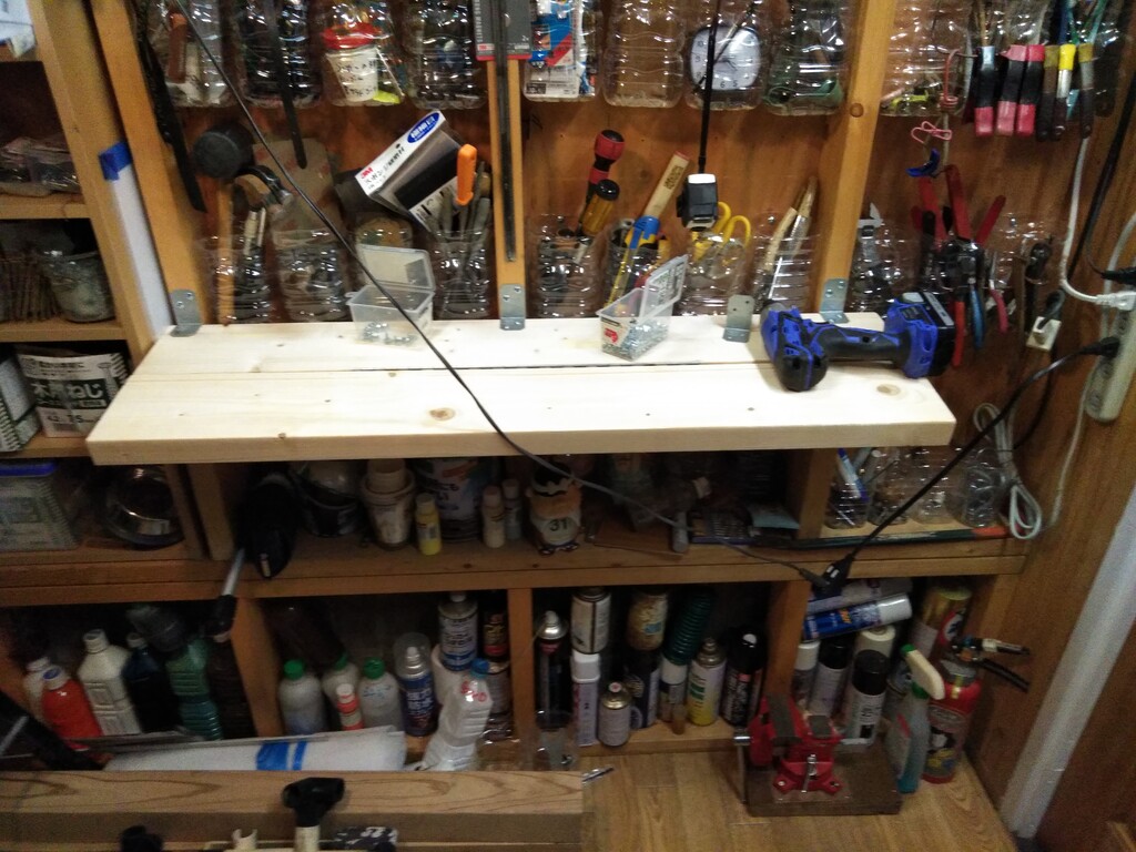 小屋造りで余った部材を使って 壁付きの作業台を作りました
