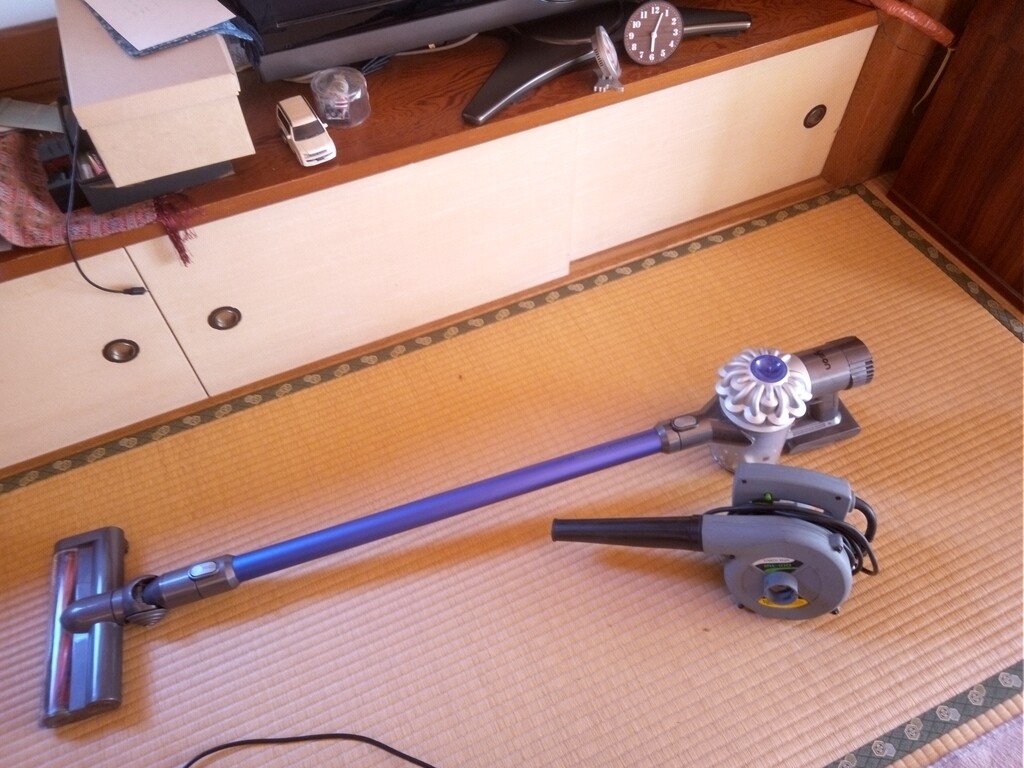 ブロアーで雪の様に舞うホコリを外に追いやってから掃除機をかけます
