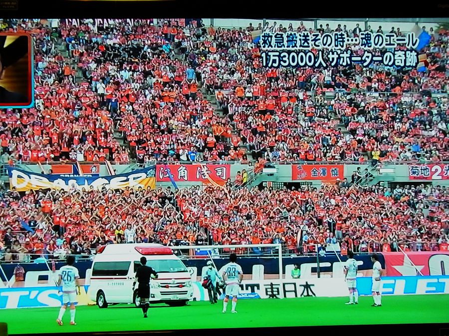 1-1で後半終わり際 決死のヘディングでアルディージャが勝ち越したのですが その際相手キーパーと顔面同士が激突! 両者もんどり打ってピッチに倒れ動けず 顔面を伝って芝生に血が流れます
