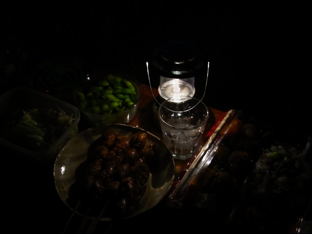 電池ランタンを持って来ました ビール 枝豆 焼き鳥 お弁当