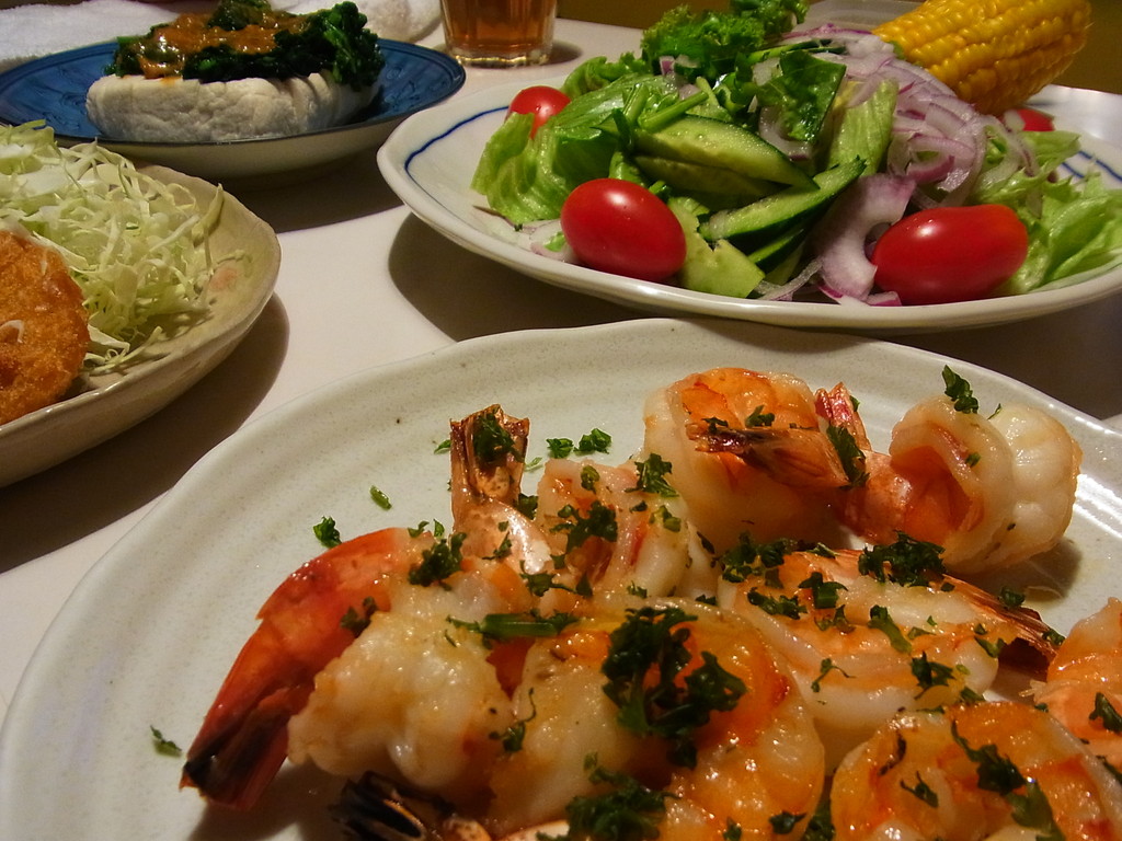 お皿にのったガ−リックシュリンプ、見ただけで美味しさがわかります。