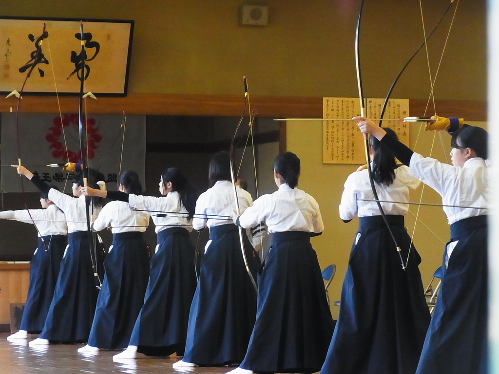 弓道場では凛々しい女子が試合中