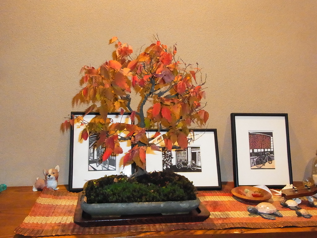 中学時代の親友が泊まって行くので 自宅玄関にケヤキの盆栽を飾りました
