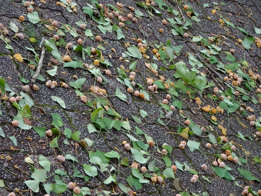路面にはギンナン どんぐり ハナミズキの赤い実 松ぼっくり