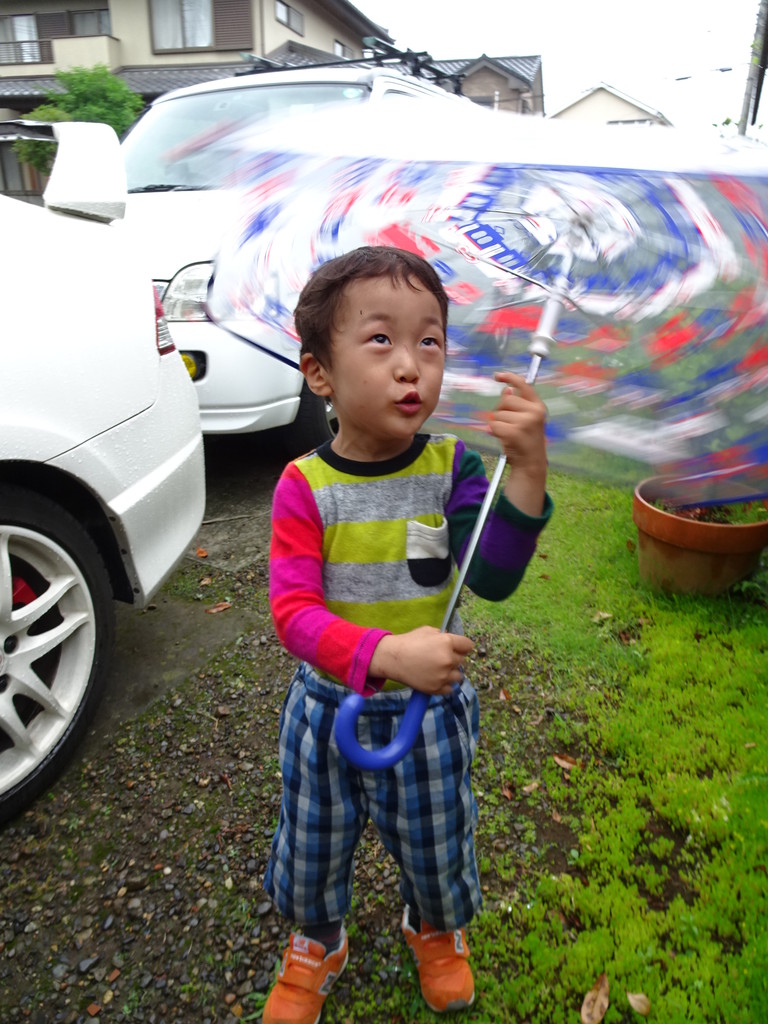 電車柄のカサをぐるぐる