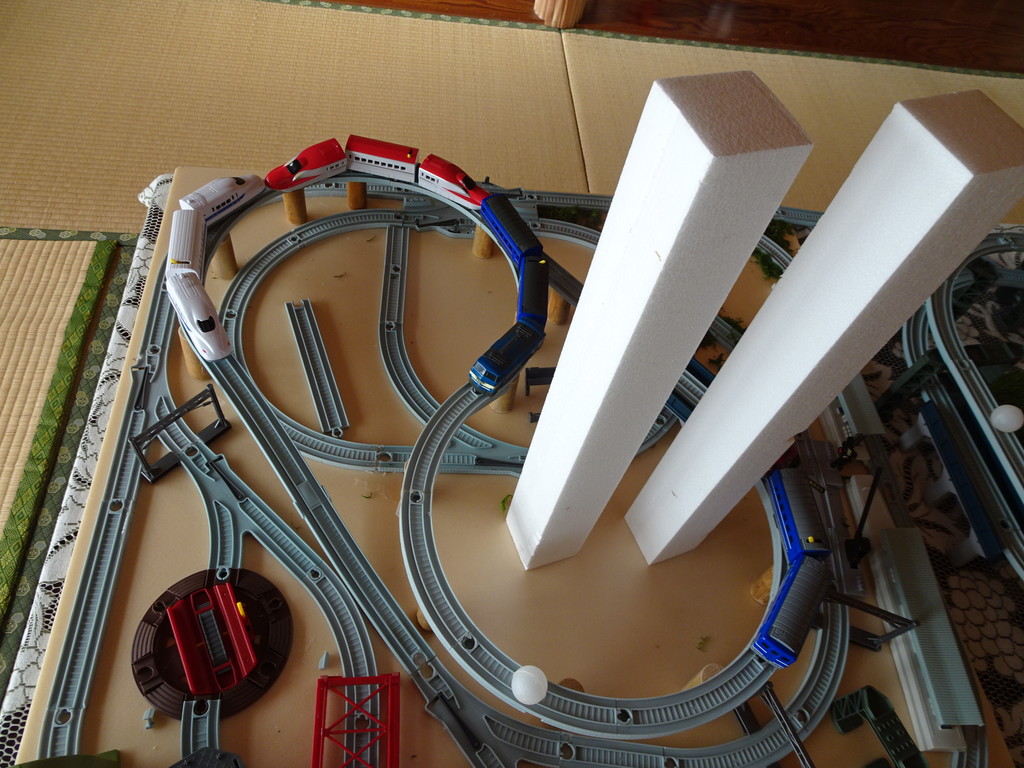 物置の部材に入っていた緩衝材の発泡スチロールをツインタワービルにしてみましたw