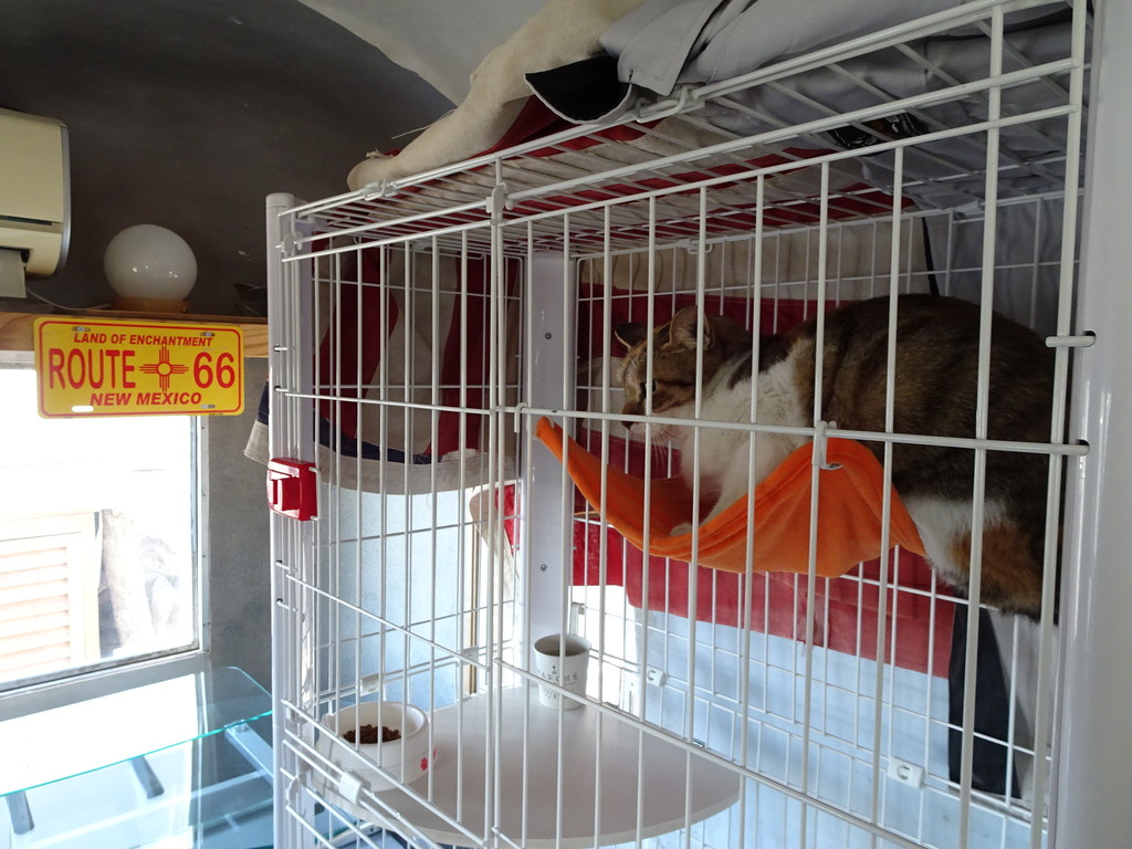 エアストリームの中は 迷い込んで来た野良猫親子のために タワー型のケージを買って来て 動物愛護センター状態になってました