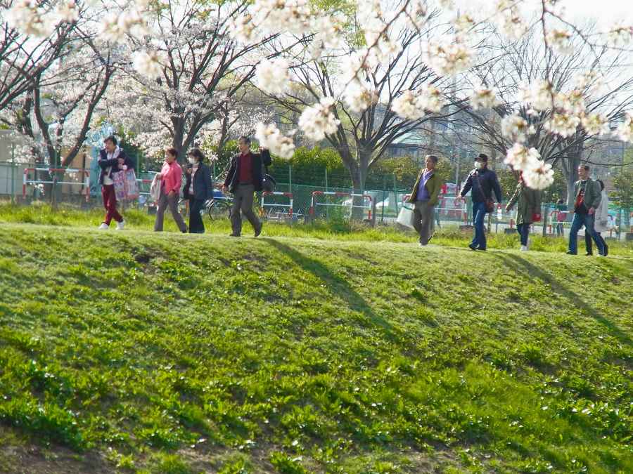 PHミニで会場へ急ぎます 土手のあちらこちらでもお花見をしています
