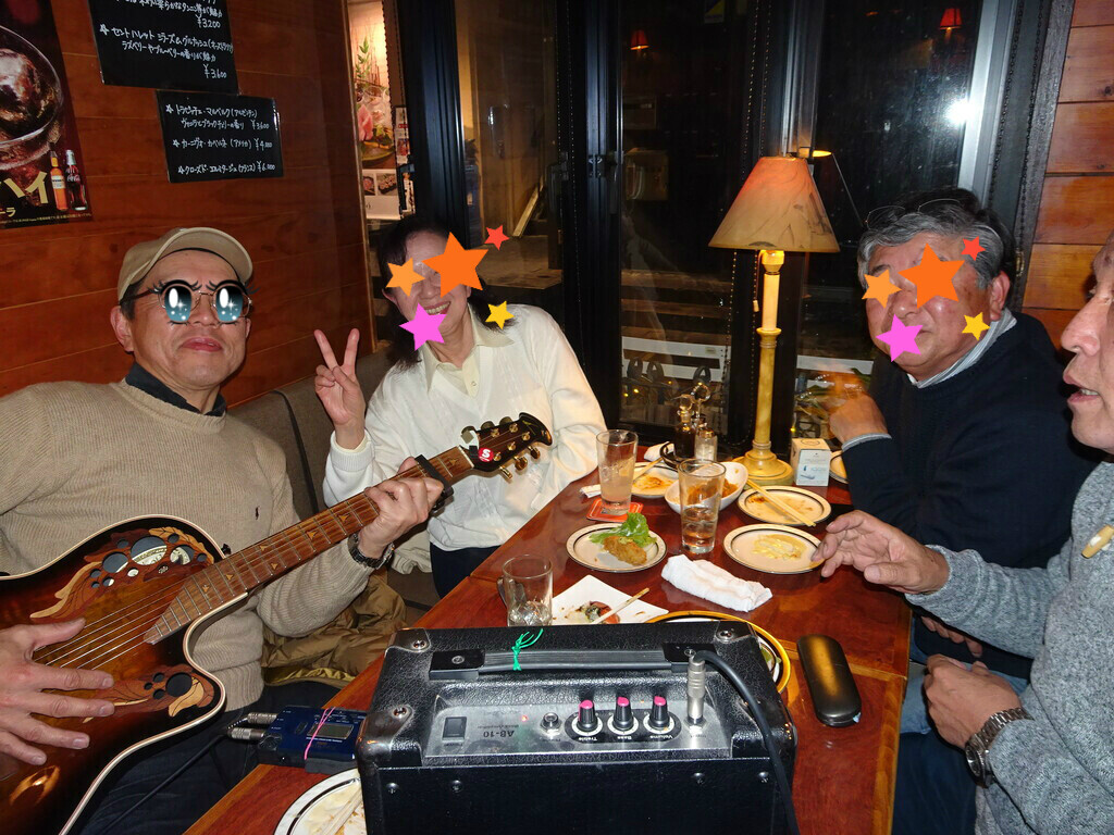 ギターを持ち込んで友人と二人でセッション 懐メロで大盛り上がり